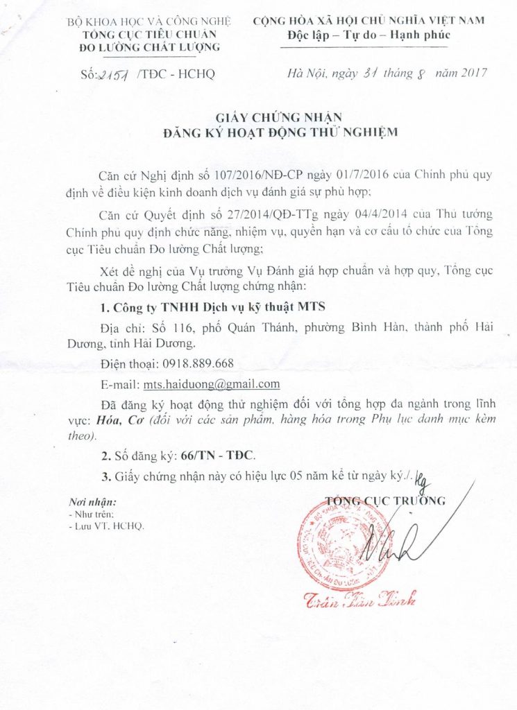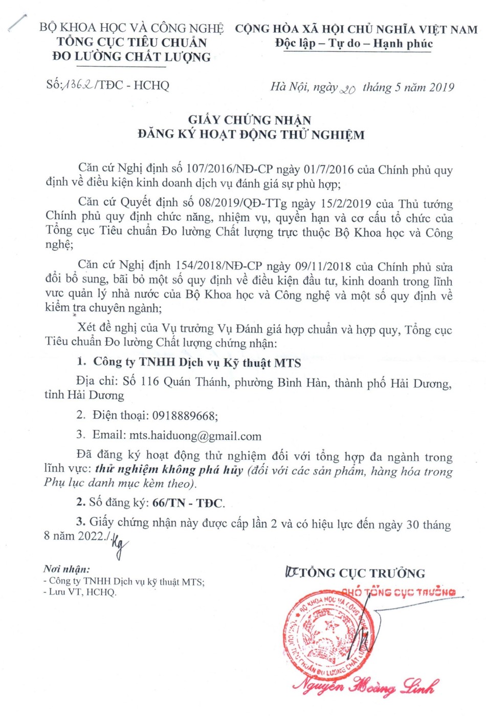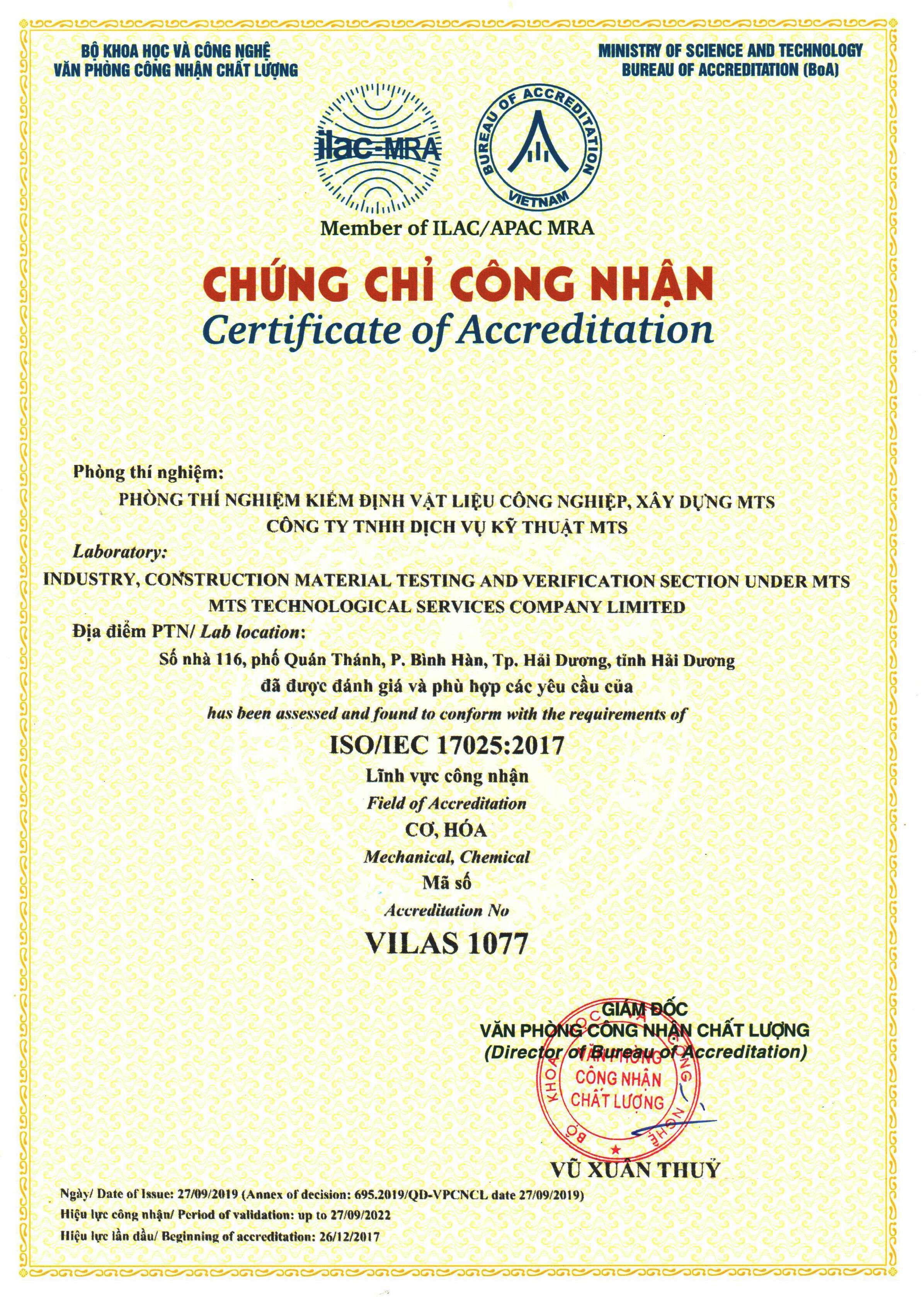Hoạt động của Phòng thí nghiệm MTS được duy trì và kiểm soát thông qua hệ thống quản lý chất lượng ISO/IEC 17025 : 2017 do Văn phòng công nhận chất lượng (BoA) thuộc Bộ Khoa Học và Công Nghệ đánh giá và chứng nhận với mã số VILAS 1077.
