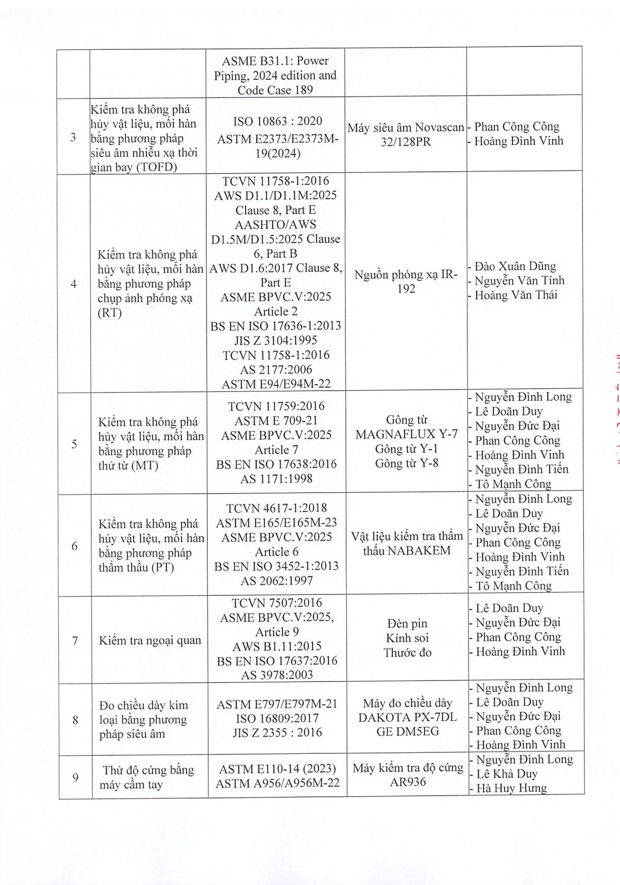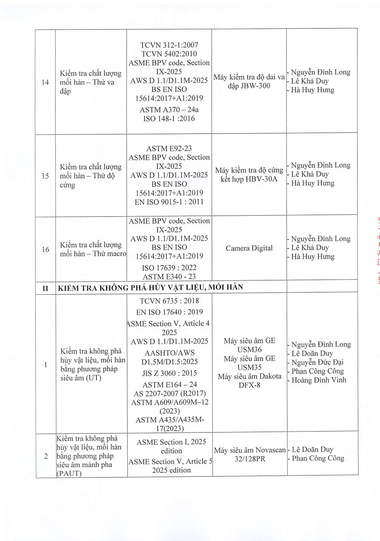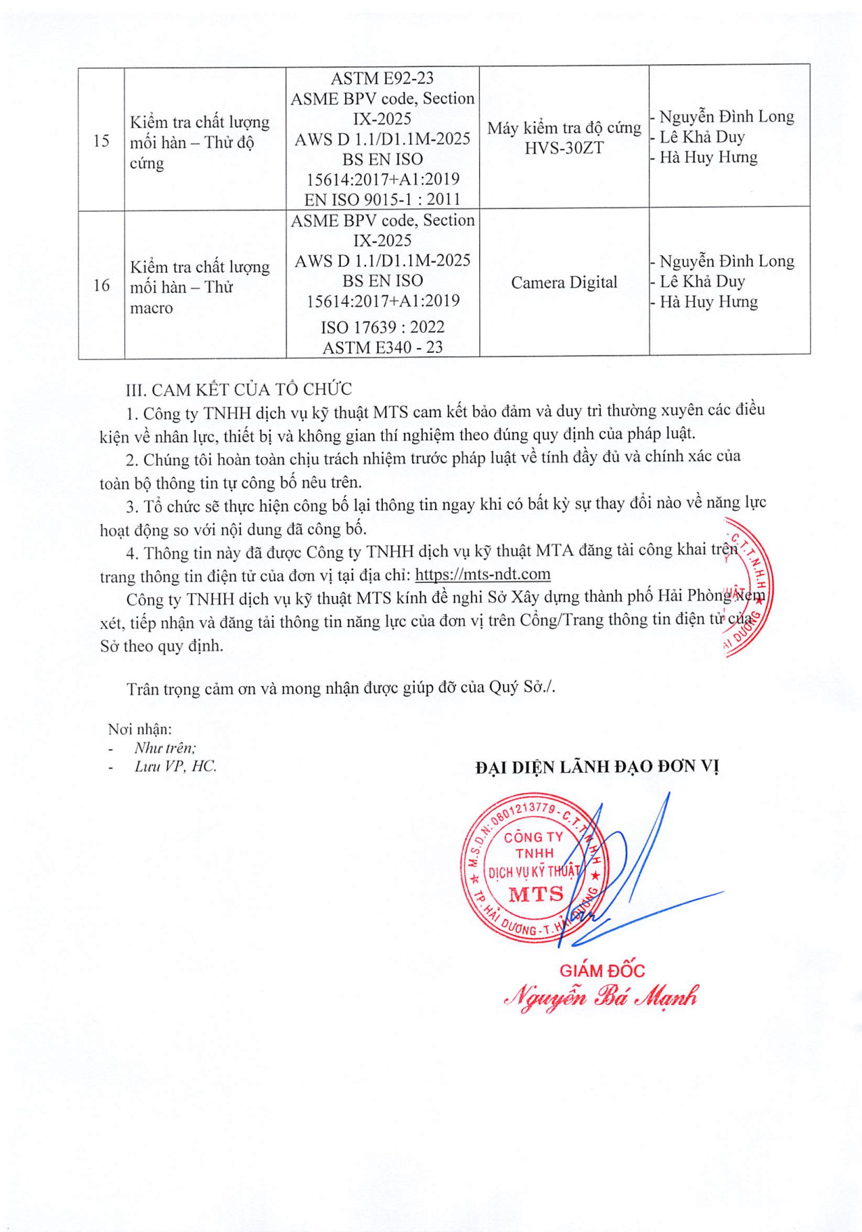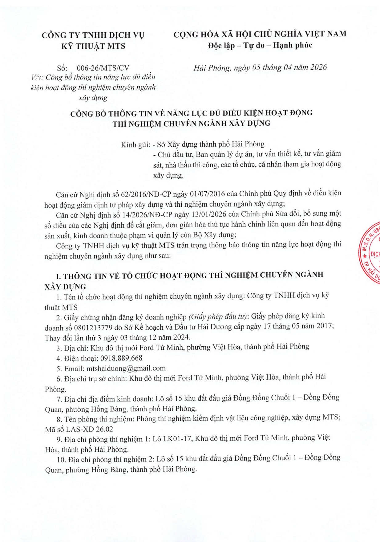 Công bố thông tin về năng lực đủ điều kiện hoạt động thí nghiệm chuyên ngành xây dựng của Công ty TNHH dịch vụ kỹ thuật MTS