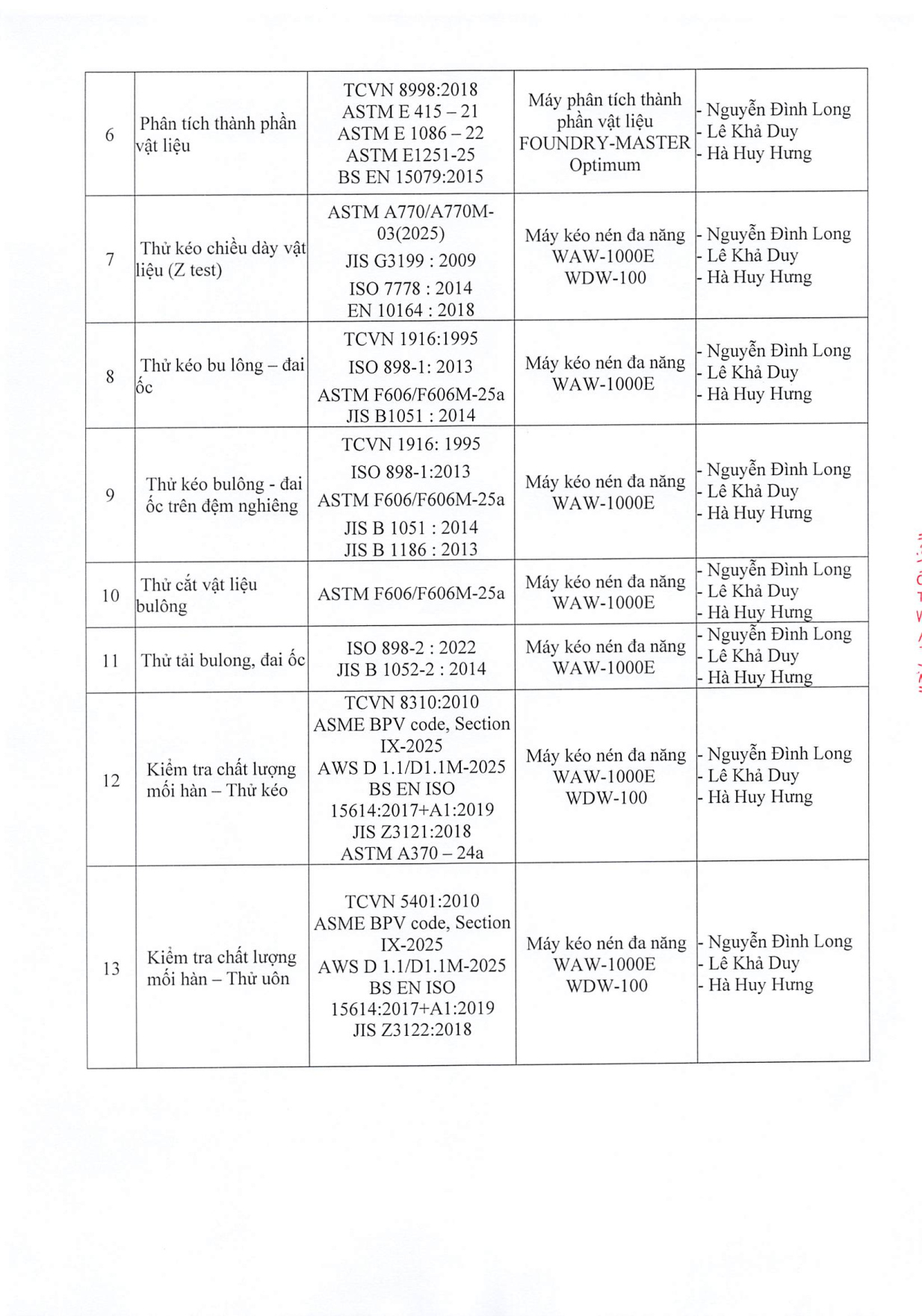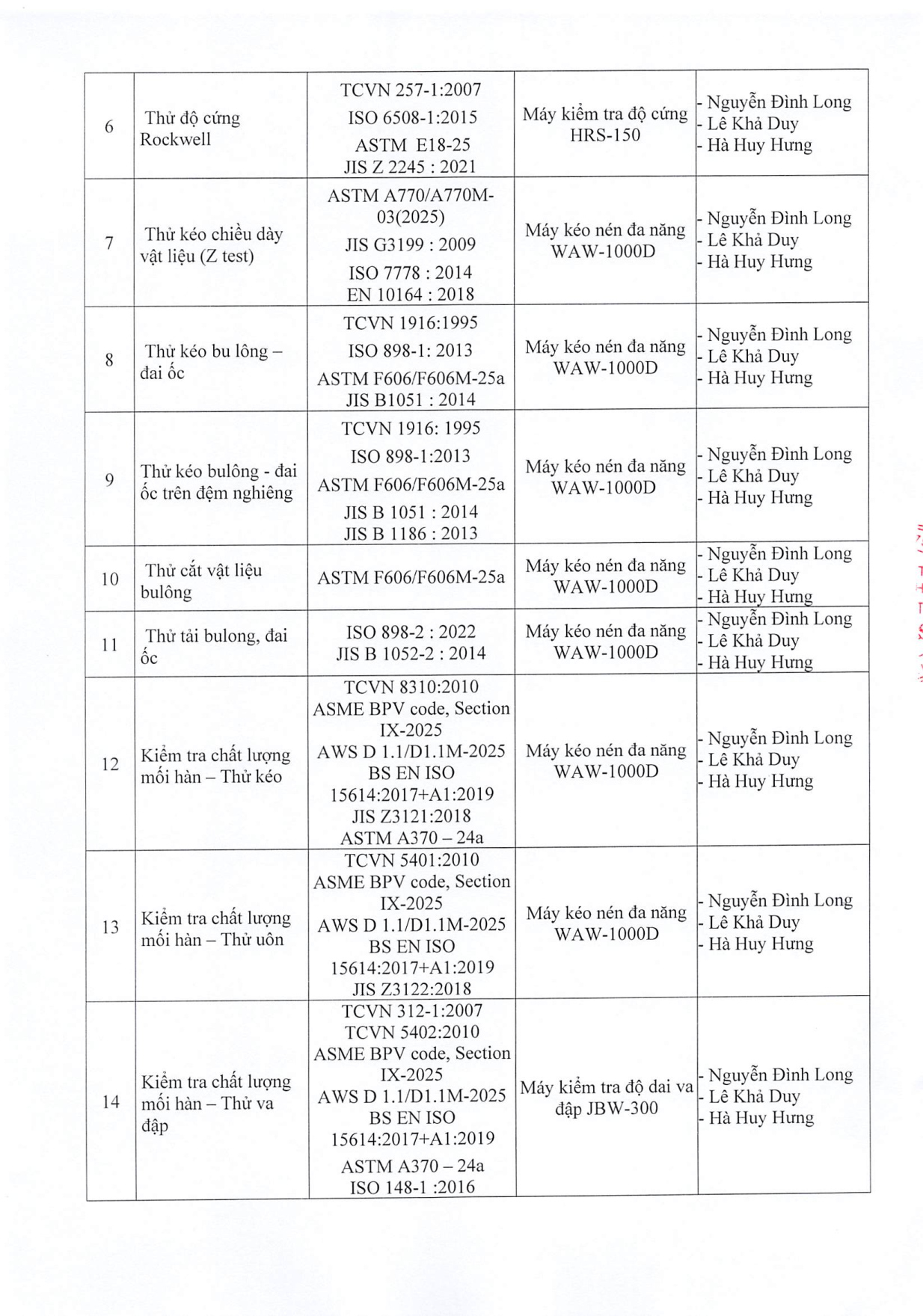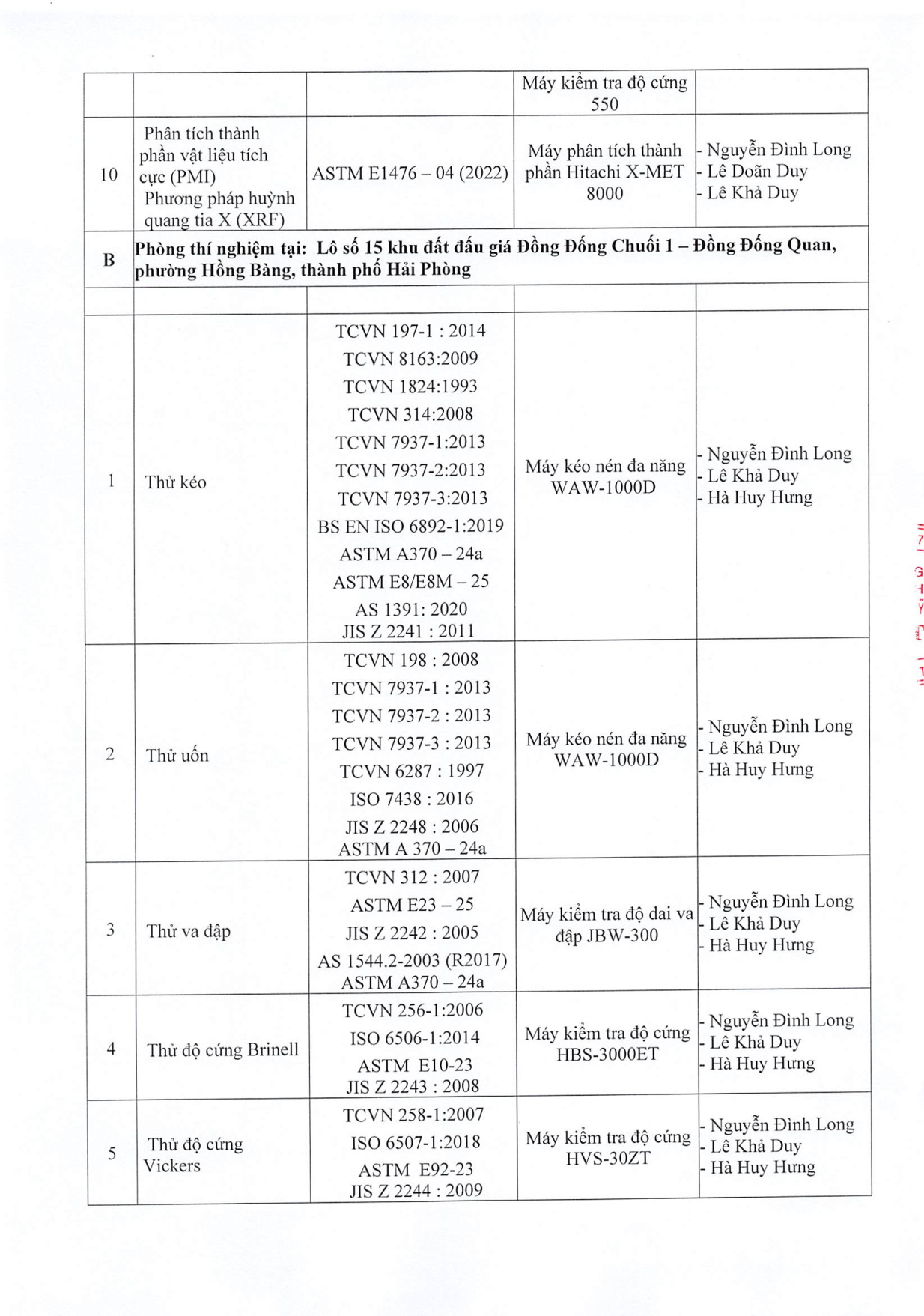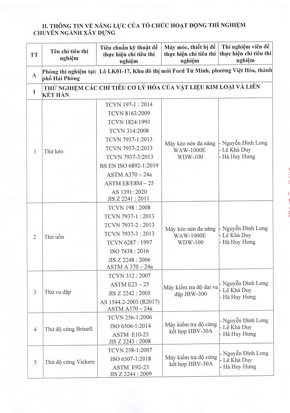 Công ty TNHH dịch vụ kỹ thuật MTS trân trọng thông báo thông tin năng lực hoạt động thí nghiệm chuyên ngành xây dựng như sau: